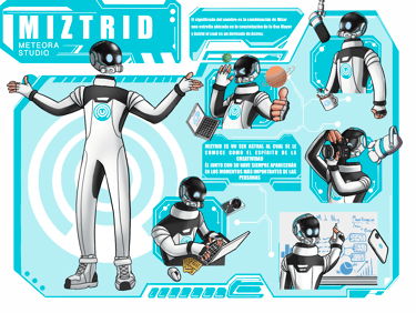 Miztrid, el Espíritu de la Creatividad, se presenta como un faro de inspiración dentro de la agencia de publicidad que combina arte, tecnología e ingenio para satisfacer las necesidades de sus clientes. Antiguamente un astronauta con una personalidad animada y noble, Miztrid siempre alentaba a quienes lo rodeaban a superar límites y explorar lo desconocido. Ahora, transformado por el contacto cósmico con una Nova, su esencia se ha convertido en una fuerza creativa que guía el trabajo de la agencia.